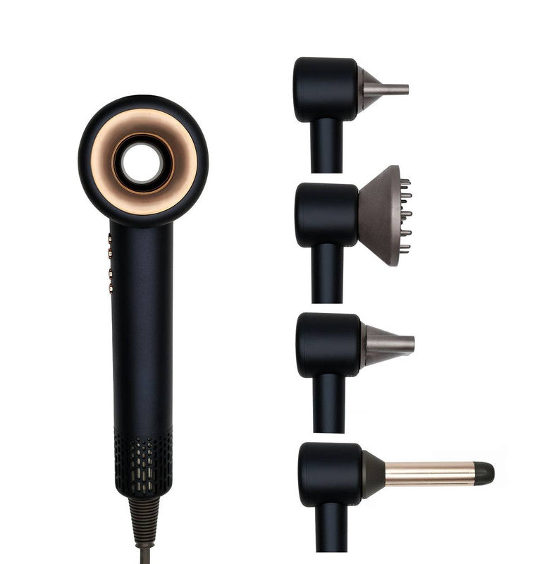Į džiovintuvo komplektaciją įeina 4 skirtingi antgaliai, įskaitant difuzorių ir "Curl Bomb" garbanų sukimo antgalį kuris oro srautu sugauna sruogą.