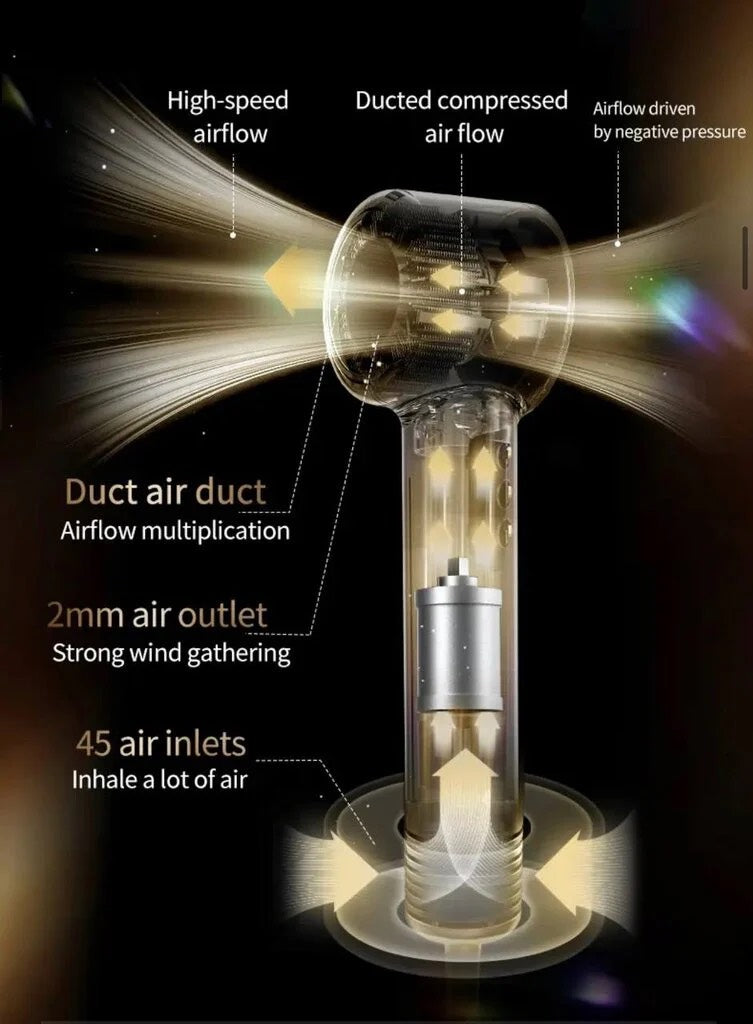 Turbojet Sistema. Tai inovatoriška oro pūtimo sistema, kuri generuoja didžiulį oro srautą iš apačios į viršų. Taip plaukams tiekiamas oras yra itin koncentruotas, tačiau tuo tarpu ir itin švelnus, nežalojantis plaukų.