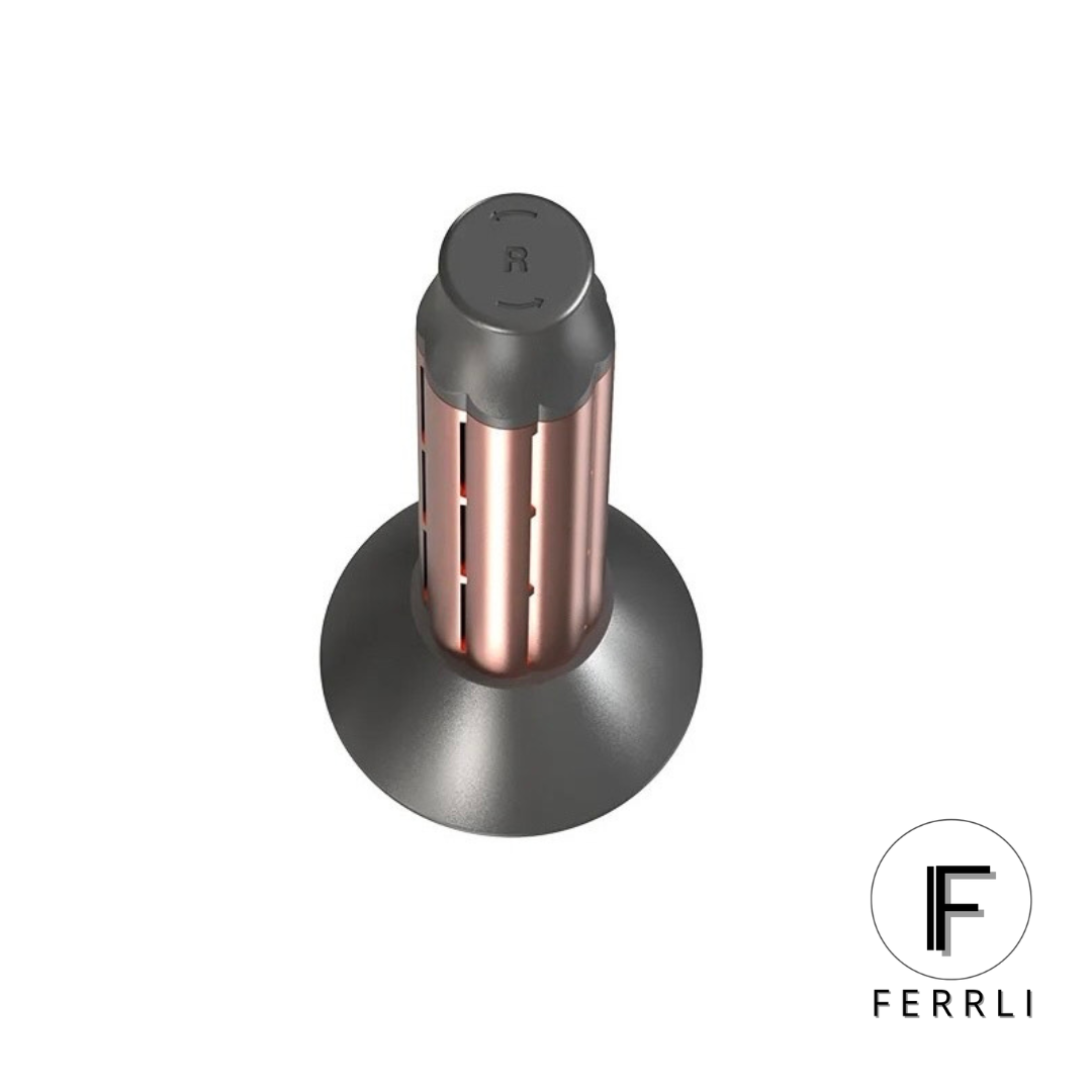 Neįtikėtino efektyvumo daugiafunkcis SUPERIONIC plaukų džiovintuvo antgalis, oro srove pats sugauna sruogą ir stilizuodamas padaro garbanas, bangas. Garbanos itin blizgios, žvilgančios dėl turmalino dangos. Dešinė (RIGHT) formavimo pusė.
